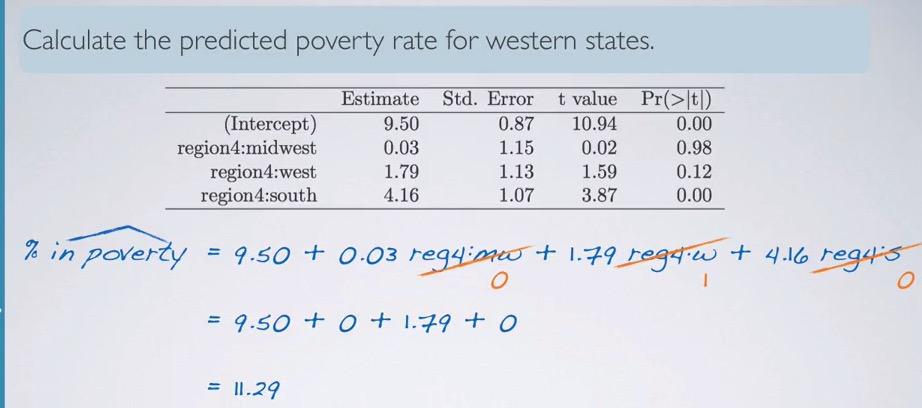 So if we want to focus on west, we can eliminate all the pther slopes so we only have west weight parameters, and the resulting will be 11.29. To interpret this we say, the model predicted 11.29% poverty on average of western state.