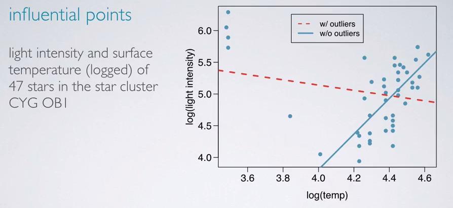 This is an example of points between light intensity and temperature, by log scale. We can see that with/without outliers, the slope of the line vary greatly. It's depend on what type of finding that you want to focus. If outliers are more interesting thing, then you should include the outliers. But one can not simply join all the trend and outliers. Divide them into two groups, trend and outliers, and make regression line for each of the group. Don't join the model altogether, because it will hurt the model.