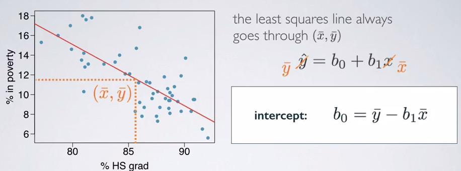 So least squares line always passes through point average of explanatory and response variable. Using this idea, we can calculate the intercept value as: