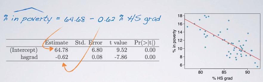 Using intercept and slope from previous example, we can simply plug the explanatory, 82 to the resulting formula. What we get is 13.84. So based we can say on states, given that the state have 82% HS graduation rate, we predict that 13.84% on average in the poverty line. But beware of some extrapolation.